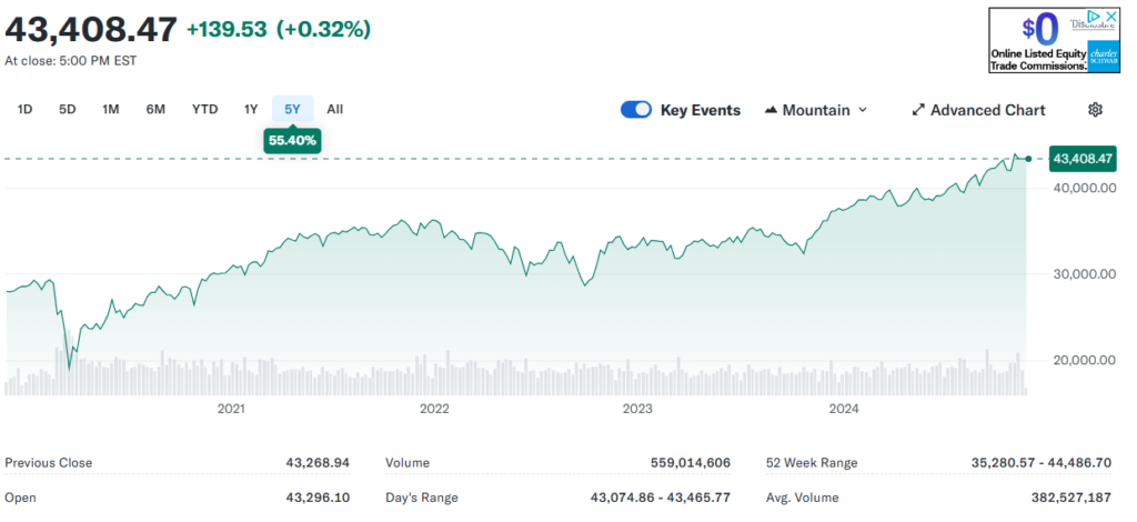 En el Gráfico 1 se puede apreciar el comportamiento del Dow Jones en los últimos 5 años. Como se observa, el índice ha mostrado una tendencia alcista, pasando de un valor promedio de $25,000 en 2019 a aproximadamente $43,000 a finales de 2024.